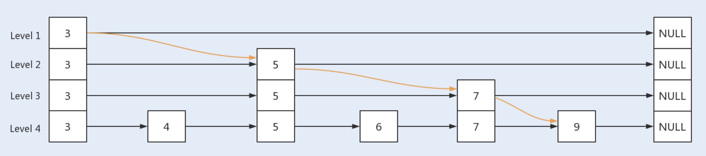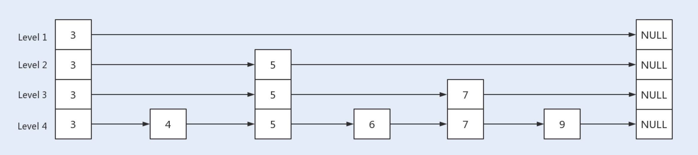 - 每一层由下往上依次通过一个指针指向上层相同值的元素,每层数据依次减少,到最顶层只会保留部分数据