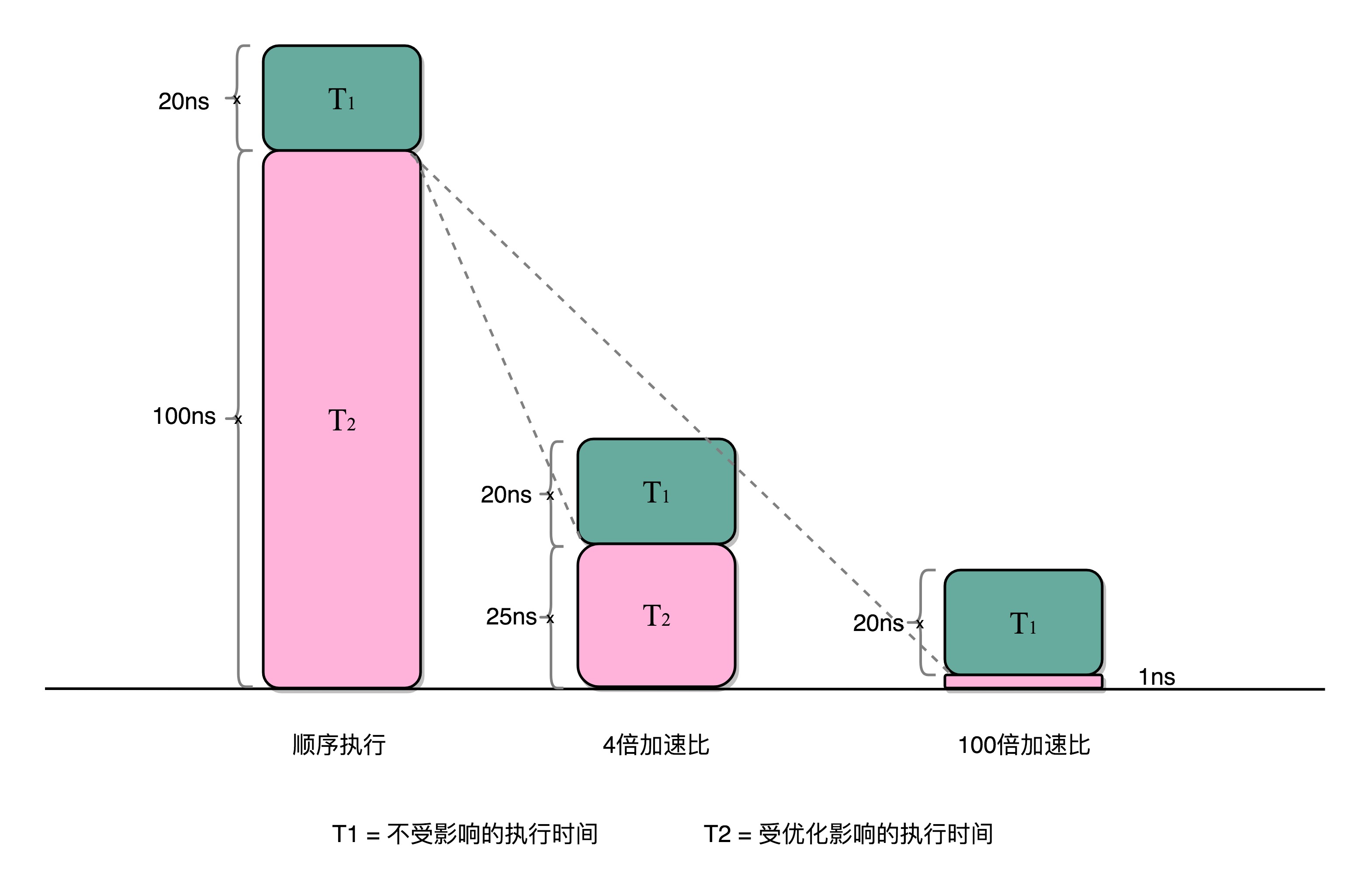 | 1 | 优化后的执行时间 = 受优化影响的执行时间 / 加速倍数 + 不受影响的执行时间 |