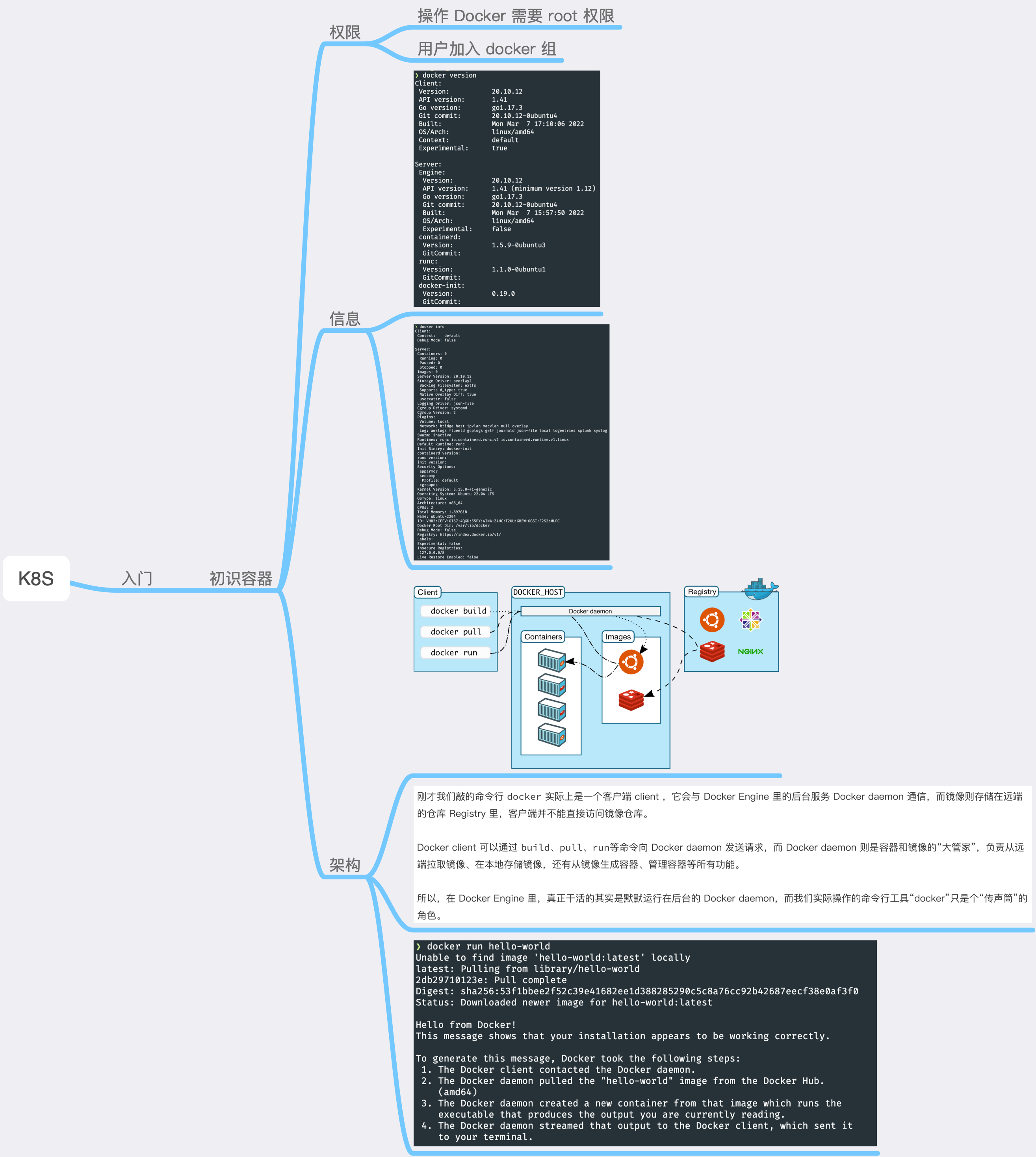 Architecture 核心是 Docker daemon Flow123456789101112131415161718192021222324252627$ docker run hello-worldUnable to find image 'hello-world:latest' locallylatest: Pulling from library/hello-world2db29710123e: Pull completeDigest: sha256:faa03e786c97f07ef34423fccceeec2398ec8a5759259f94d99078f264e9d7afStatus: Downloaded newer image for hello-world:latestHello from Docker!This message shows that your installation appears to be working correctly.To generate this message, Docker took the following...