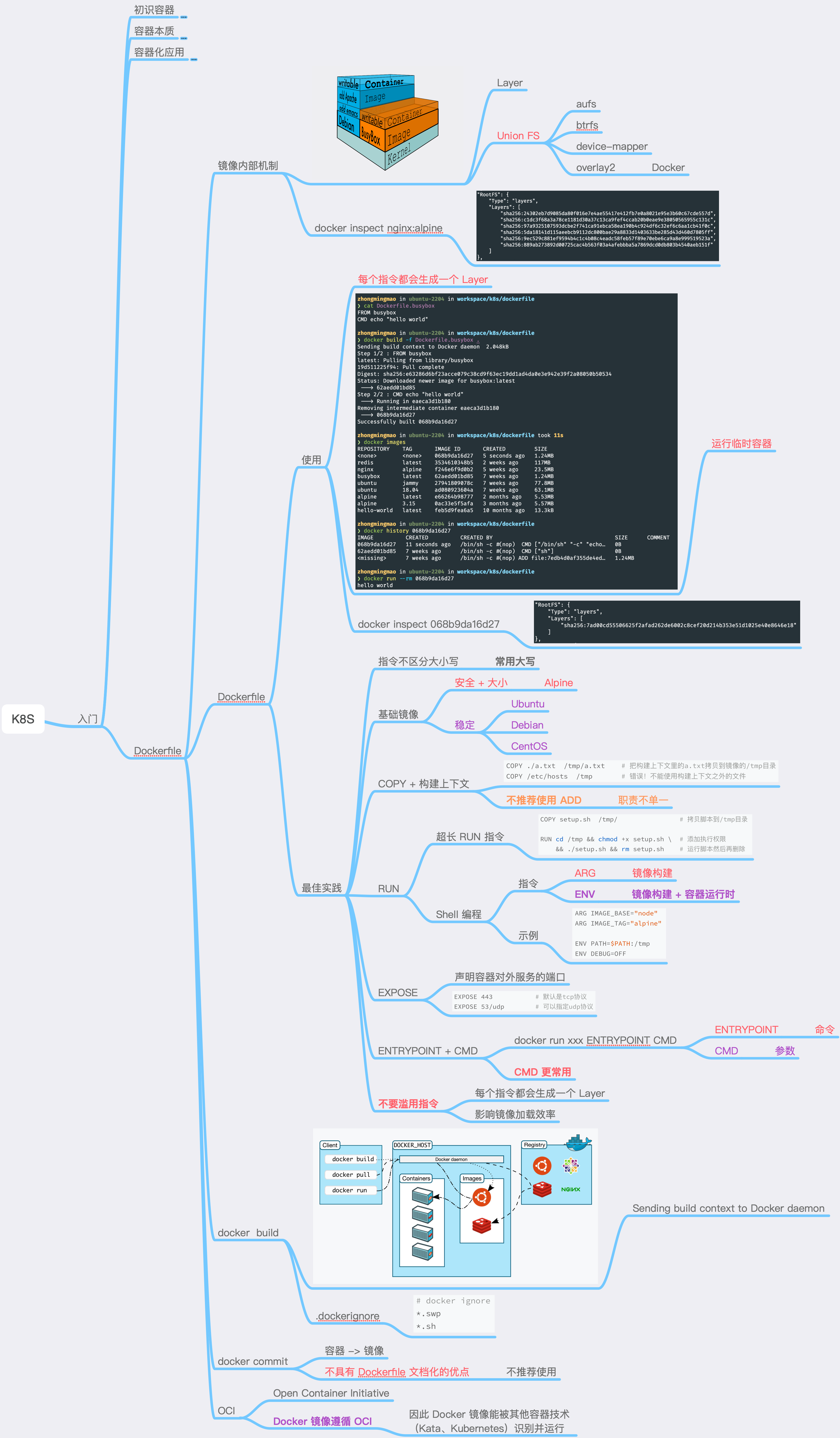 Image 镜像由多层 Layer 组成,Layer 是一组只读不可修改的文件,Layer 可以在镜像间共享Image = Layer + Union FS 1234567891011121314$ docker inspect nginx:alpine... "RootFS": { "Type": "layers", "Layers": [ "sha256:e5e13b0c77cbb769548077189c3da2f0a764ceca06af49d8d558e759f5c232bd", "sha256:07099189e7ec257e501d9625507b55e0ea32c330e38c90d8533b3fa2a7a97069", "sha256:fcf860bf48b4e20f24f44ba02...