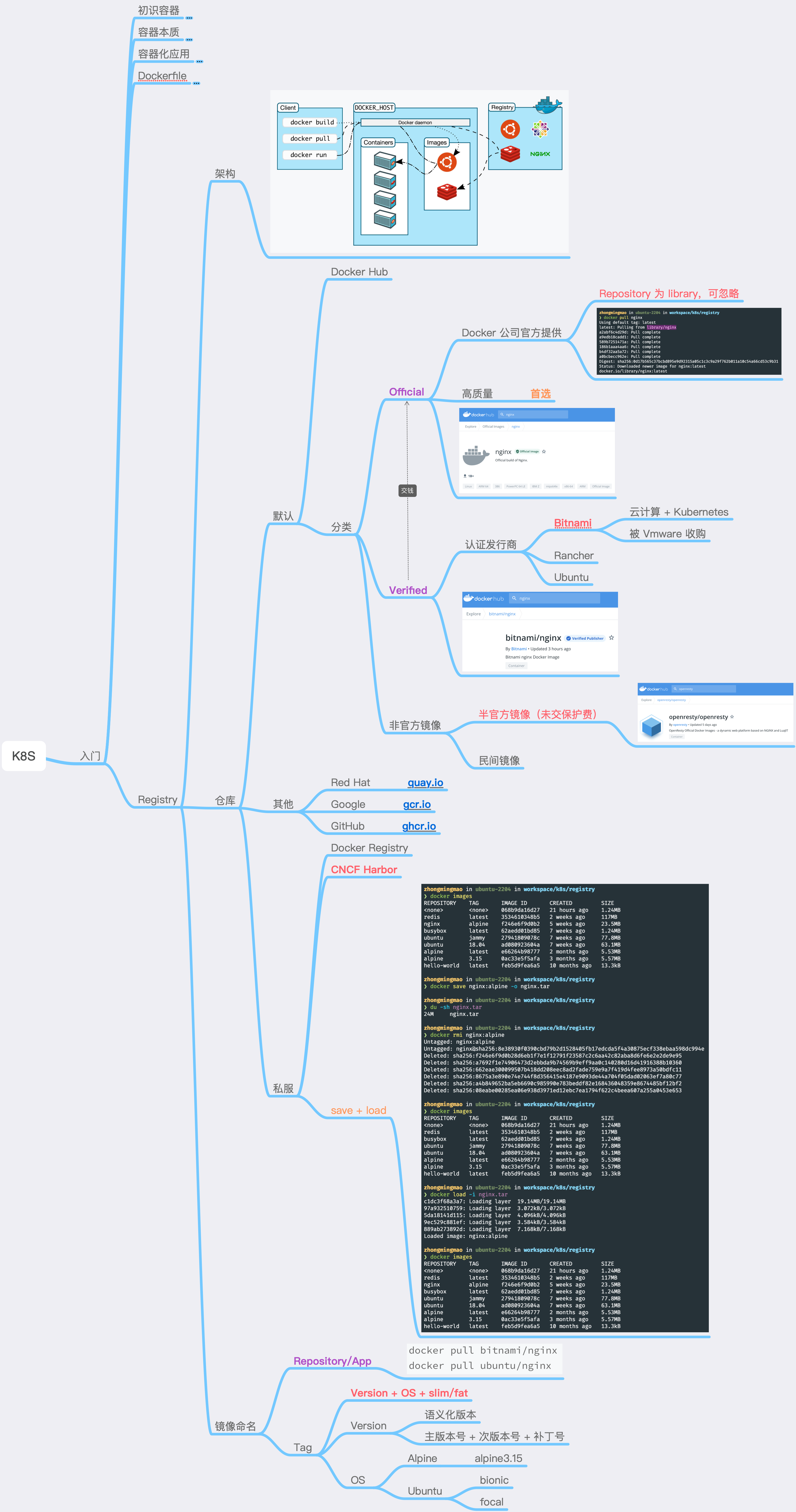 Registry Registry -> Repository Docker Hub 默认 Registry ImageOfficial Dockerhttps://hub.docker.com/u/library Verified Bitnami / Rancher / Ubuntu Unofficial半官方 开通 Verified publisher,需要付费 民间 个人镜像 Naming user/app:tagtag = version + osslim / fat OS Example Alpine / CentOS alpine3.15 Ubuntu 18.04 bionic Ubuntu 20.04 focal Debian 9 stretch Debian 10 buster Debian 11 bullseye FlowOnline1234567$ docker login -u zhongmingmaoPassword:WARNING! Your pas...